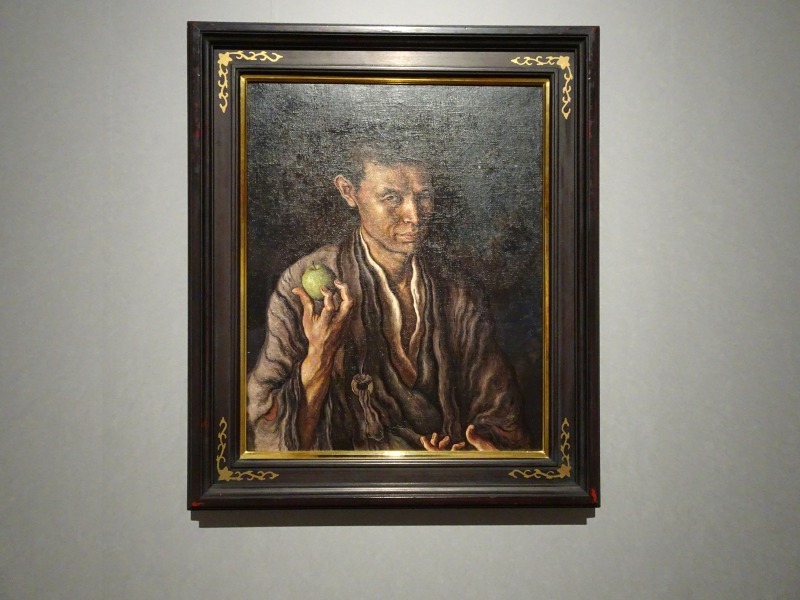 禅宗で用いられる法衣の一種である「絡子」を着たこの作品は、野十郎33歳の時の自画像で、デューラーや劉生や草土社の影響が強く、野十郎も同時代の美術史の流れの中に居たのでした。