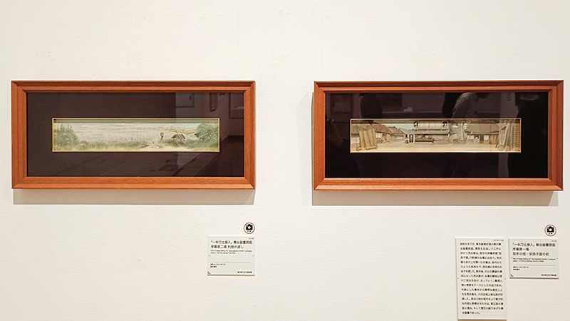 (左から)小村雪岱《「一本刀土俵入」舞台装置原画 序幕第二場 利根の渡し》、小村雪岱《「一本刀土俵入」舞台装置原画 序幕第一場 取手の宿・安孫子屋の前》 いずれも昭和6(1931)年7月 埼玉県立近代美術館 前期展示
