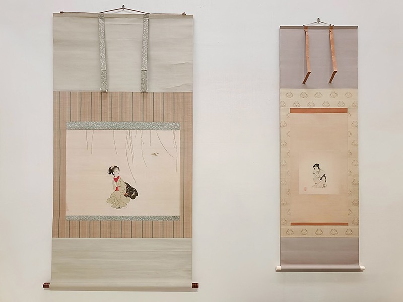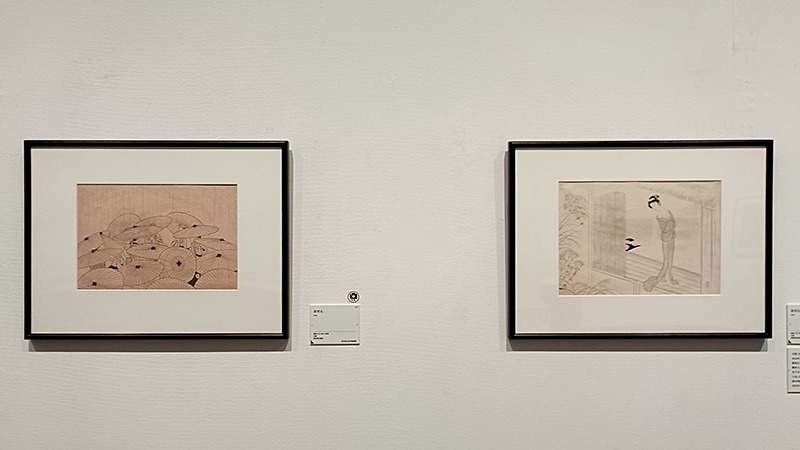 (左から)小村雪岱《春告鳥》 昭和7(1932)年頃 個人蔵(埼玉県立近代美術館寄託)、小村雪岱《茄子》 制作年不詳 金子國義事務所 金子修氏蔵 いずれも前期展示