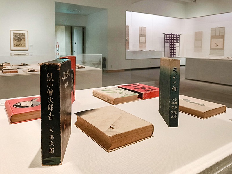 (左から)小村雪岱《大佛次郎『鼠小僧次郎吉』》 昭和7(1932)年6月27日、小村雪岱《子母澤寛『突っかけ侍』》 昭和12(1937)年5月30日 いずれも牙鳥文庫 通期展示