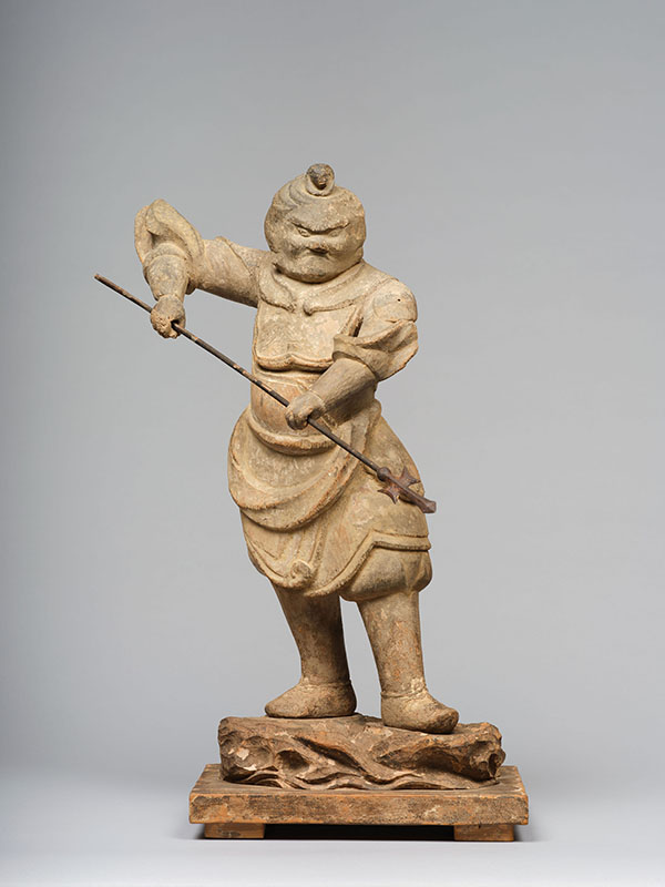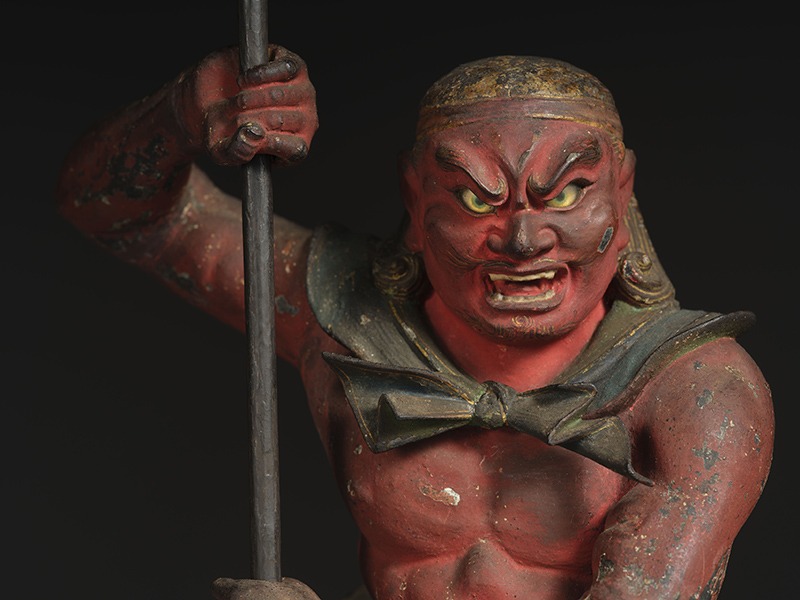 目をいからせ、武装する仏像は何とたたかい、何を護っているのでしょうか。私たちが「仏像」と聞いてまず思い浮かべるのは、柔和な表情をたたえた仏や菩薩の姿かもしれません。しかし、寺院のなかには甲冑を身にまとった四天王像や十二神将像あるいは、火炎を背負った不動明王像など、怒りの表情を見せる仏像も見られます。本展では、重要文化財《十二神将立像》(浄瑠璃寺旧蔵)を中心に、彫刻や絵画に表された神将像・明王像など、「たたかう仏像」のさまざまな姿を紹介します。これらの像には、外敵や災厄から人々を守る守護的役割が期待されていただけでなく、衆生に最も近い場所で彼らを救済し、個人の内面において「煩悩」とたたかう存在としても信仰されていました。その姿が多様であるのは、まさに人々のさまざまな現世的な願い――すなわち「祈り」――に応えるためだったのです。加えて本展では、中国・唐代の副葬品・神将俑を実に17年ぶりに展示します。墓室の入口に設置される神将俑を、その鎧の形状を継承する日本の神将像と共に展示することで、神将像の起源や役割を問いなおします。これまで彫刻史的枠組みでは取り上げられることの少なかった俑と仏像を同一空間に展示することで、新たな見方を提示します。