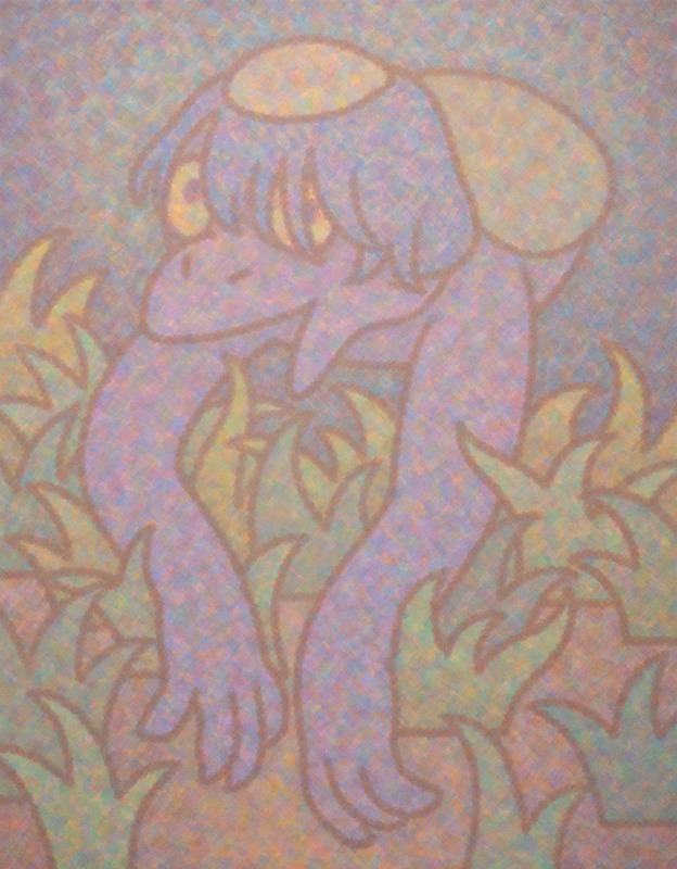 佐竹龍蔵は、2012年に京都造形芸術大学大学院修士課程芸術研究科芸術表現専攻を修了し、現在は奈良県を拠点に活動。日本画材の岩絵具の透明感を生かした独自の点描法で描き、見る距離によって色や形が変化して見える人物画や風景画を描いています。近年は、生まれ育った高知県の四万十川を取材した風最画や、奈良県の吉野の左曽川を取材し、妖怪や架空の生き物などのモチーフと組み合わせた作品を制作しています。2021年に奈良に移住し、作家活動の傍ら、美術教師として後進の指導もしています。