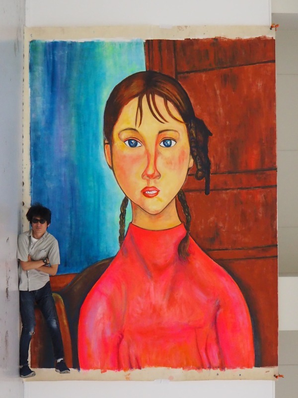 斉と公平太《おさげ髪の少女の拡大模写》(制作風景)2025年、作家蔵