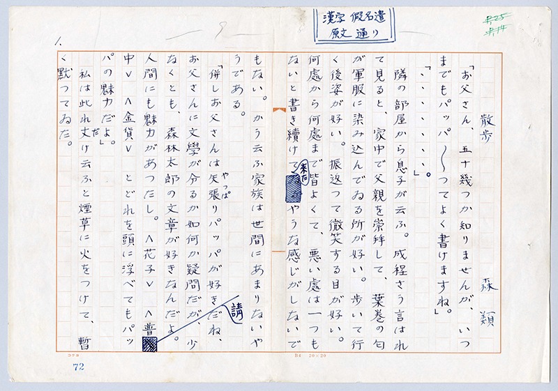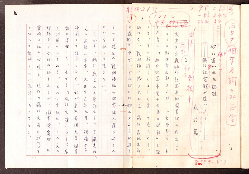昭和に入ると、鷗外に関する随筆の執筆依頼が舞い込むようになり、4人はそれぞれの言葉で、文学者でも陸軍軍医でもない、愛する「パッパ」(家族が呼んだ愛称)を語り始めます。また、環境の変化やアジア太平洋戦争を乗り越え、鷗外遺品(愛用品、日記、原稿、書簡など)の継承に努めます。1962(昭和37)年に於菟自らが、2006(平成18)年には杏奴のご遺族が文京区に寄贈した遺品の数々は、森鷗外記念館所蔵資料の核となりました。