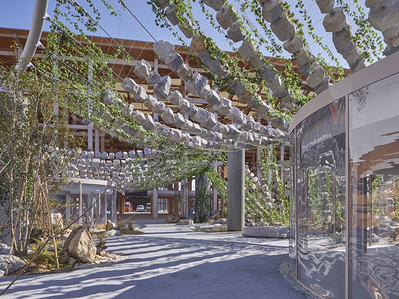 さらに、大屋根リング設計者 藤本壮介氏がデザインプロデュースした会場計画や大屋根リングが実際に使われている様子を記録した映像を展示。若手建築家が担当した3つの施設建築を紹介します。石という素材を通して“コスパ”を再考する挑戦や、1970年の万博で活用された建築技術「空気膜構造」の再解釈、また万博終了後の効果的な活用を念頭に置いた設計コンセプトなど、建築の観点からも未来社会につながる実験的な取り組みが展開されていたことを紹介します。